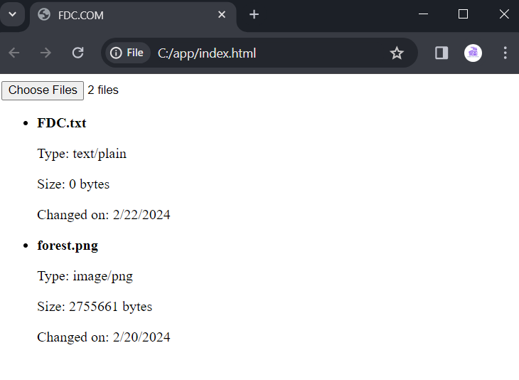 Și după selecție, codul JavaScript va obține fișierele selectate și va afișa informațiile obținute pe pagina web: